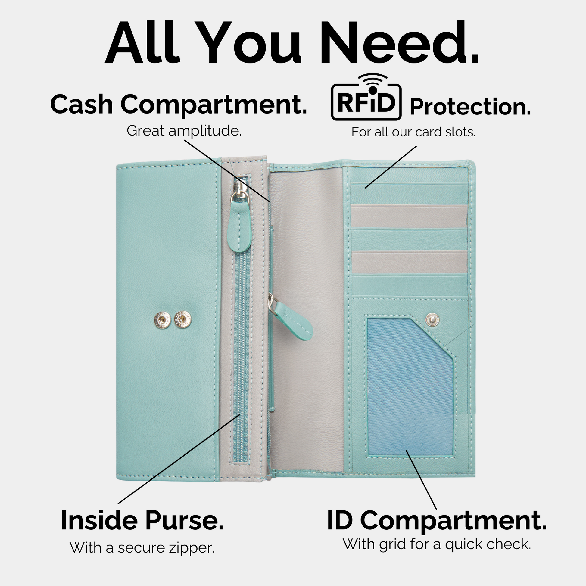 Soft on the outside, smart on the inside—this genuine leather wallet brings together elegance and everyday function in one beautifully crafted piece. The fresh mint exterior and contrasting grey interior offer a modern, sophisticated look that stands out effortlessly.